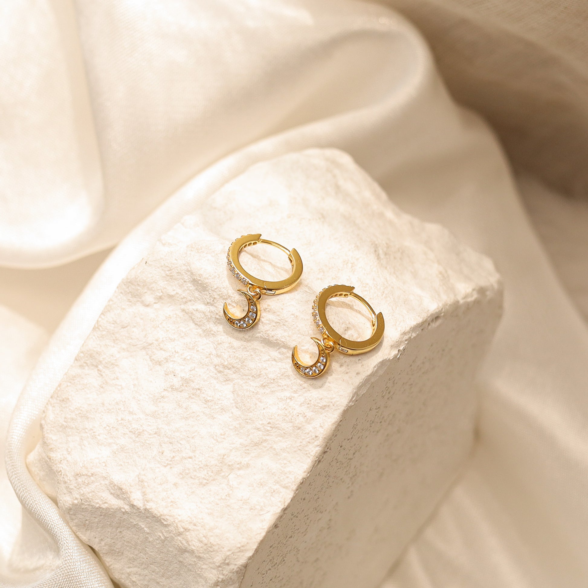 Elevate your elegance with these Clear Stone Moon Hoop Earrings. Featuring delicate moon-shaped hoops adorned with sparkling clear stones, they offer a refined shimmer that complements any outfit. Perfect for adding a subtle yet sophisticated touch to your look, these earrings blend timeless design with modern grace.